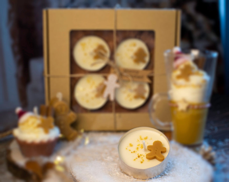 Jedes Teelicht ist kunstvoll gestaltet und mit einem winzigen Lebkuchenmännchen verziert, das auf der Oberfläche thront.